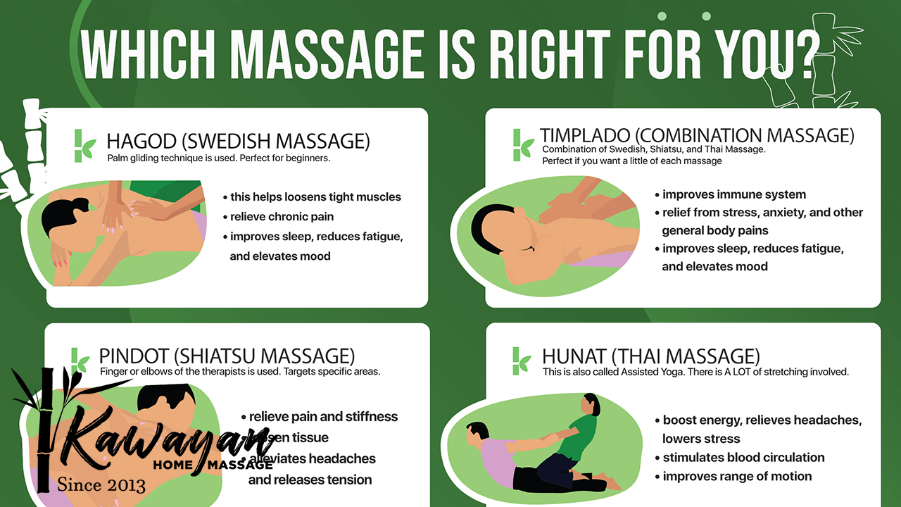 Booking your Home Massage with Kawayan Massage is easy! Simply send us a text message or chat with us on Facebook with the following information: